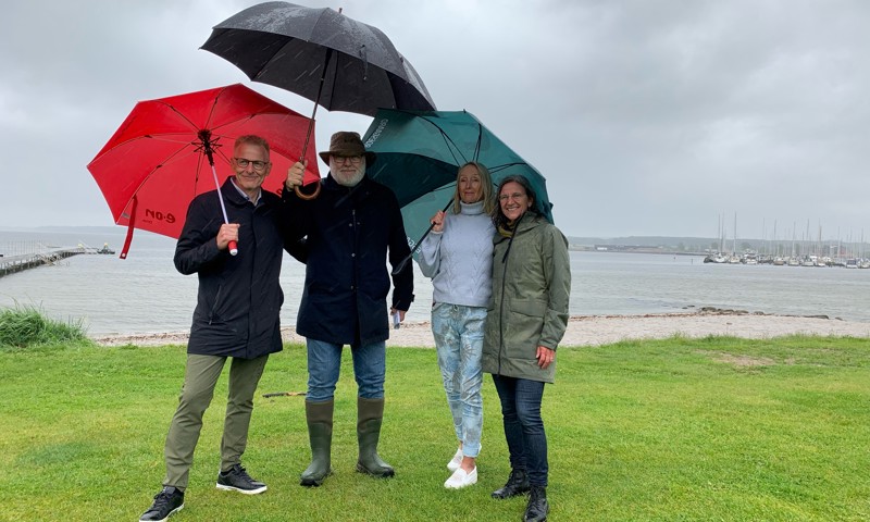 Trods regn og rusk var de store smil fremme, da Løvbjerg Fonden lørdag satte beløb på deres donation til Ren Horsens Fjord-fonden. Her er borgmester Peter Sørensen, bestyrelsesformand i Løvbjerg Fonden Erik Løvbjerg, bestyrelsesmedlem Karen Margrethe Johansen og formand for bæredygtigheds, natur og klimaudvalget Rikke Christensen samlet. Foto: Horsens Kommune