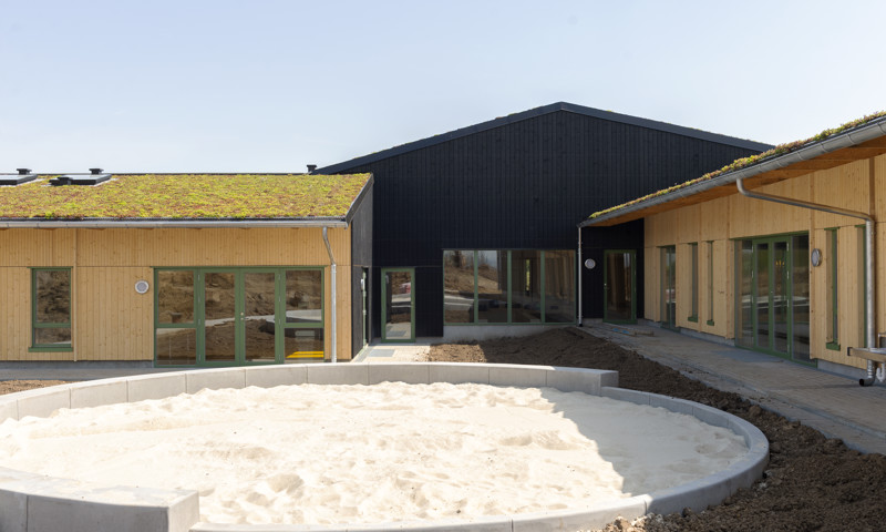 - Det nye dagtilbud ligger i et unikt naturområde og er samtidig opført efter nogle principper, der virkelig lukker naturen ind. Det gælder på legepladsen, men også indenfor, hvor store dele af møblerne er bygget af træ. Derudover rummer institutionen to multi-værksteder, som børnene kan udfolde deres kreativitet i. Det giver dem nogle enestående rammer at lege, lære og udforske i.